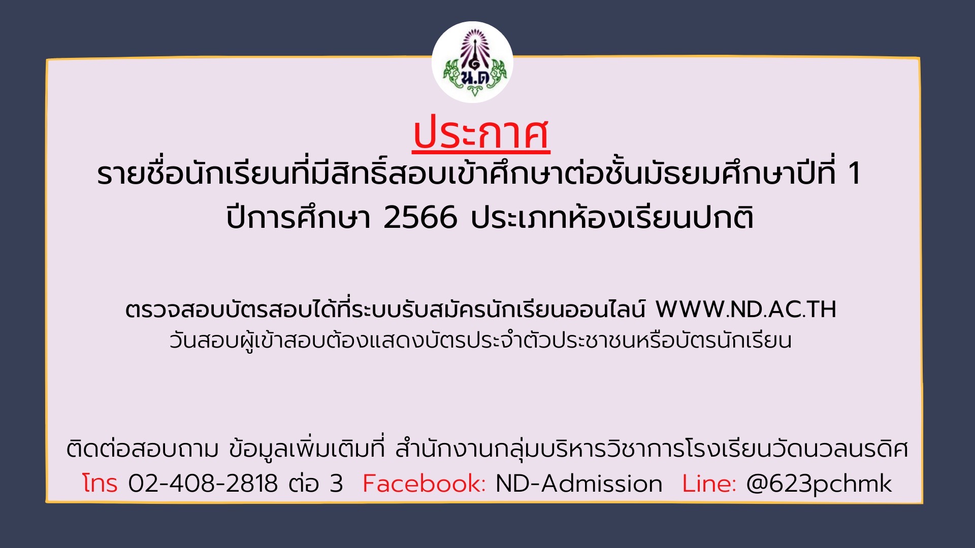 22 Mar ประกาศรายชื่อนักเรียนที่มีสิทธิ์สอบเข้าศึกษาต่อ ม.1 ม.4 ปีการศึกษา 2566 ห้องเรียนปกติ Category: ข่าวประชาสัมพันธ์ Last Updated: Wednesday, 22 March 2023 09:38 Published: Wednesday, 22 March 2023 09:31 22 Mar